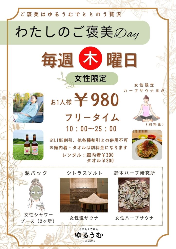 【毎週木曜日】※女性限定※わたしのご褒美Day♪
