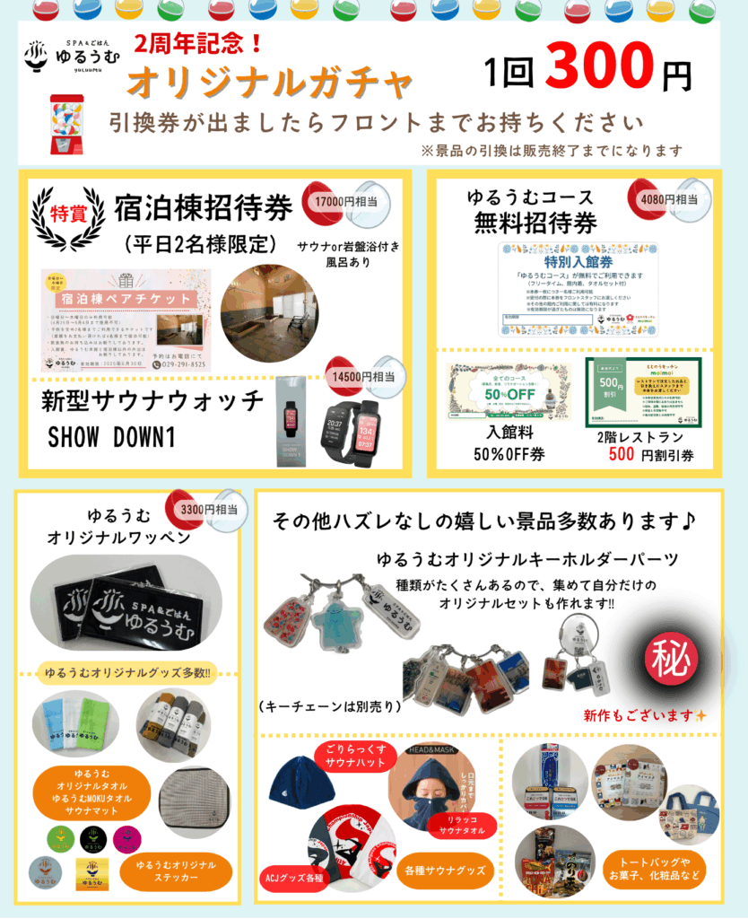 ゆるうむ2周年オリジナルガチャが設置されます!今回も豪華景品がたくさん✨