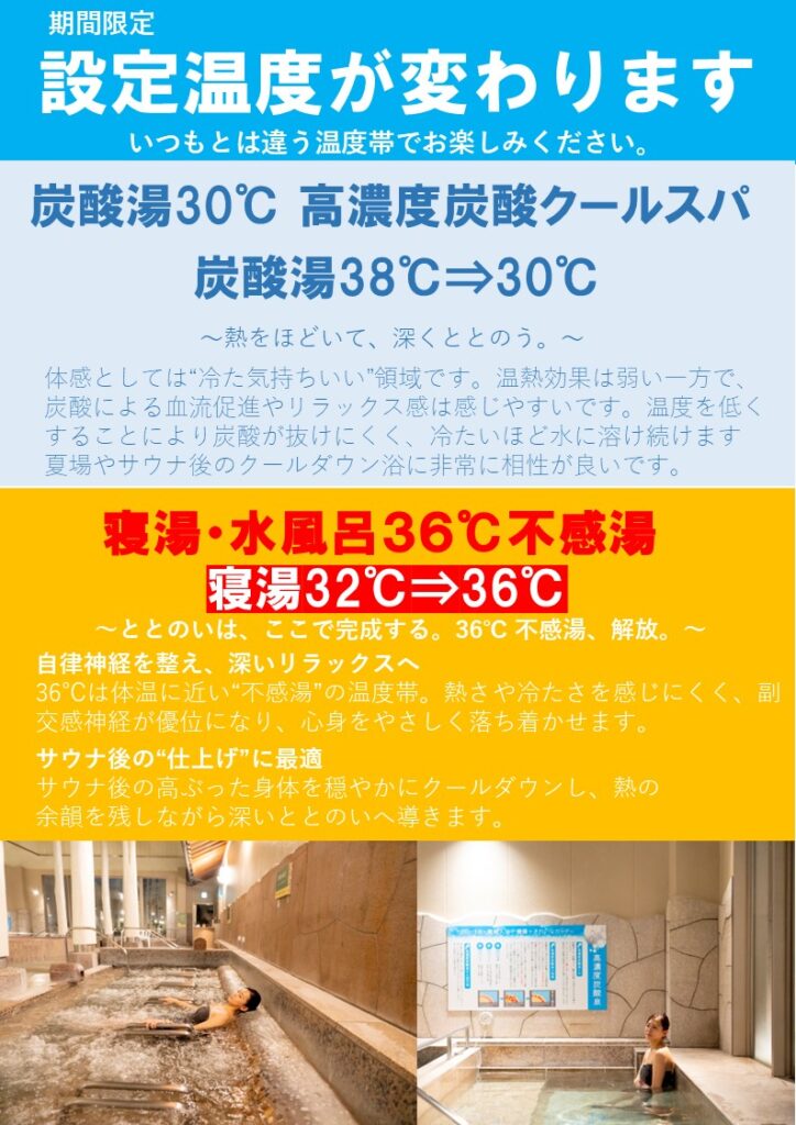 期間限定 2026年4月28日 最終更新日時 : 2026年4月28日 yuluumu 炭酸湯、寝湯・水風呂の設定温度を変更します。 炭酸湯は30℃に 寝湯・水風呂は36℃の不感湯に いつもと違う温度帯をお楽しみください。