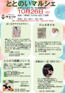 10月26日(日)は、ゆるうむ2階おこもりうるうむにて心と体をゆるめる「ととのいマルシェ」を開催します✨ オラクルセラピー・ジェルネイル・筋膜リリース・足相占いなど、どれも“ととのう時間”にぴったりな癒しの […]